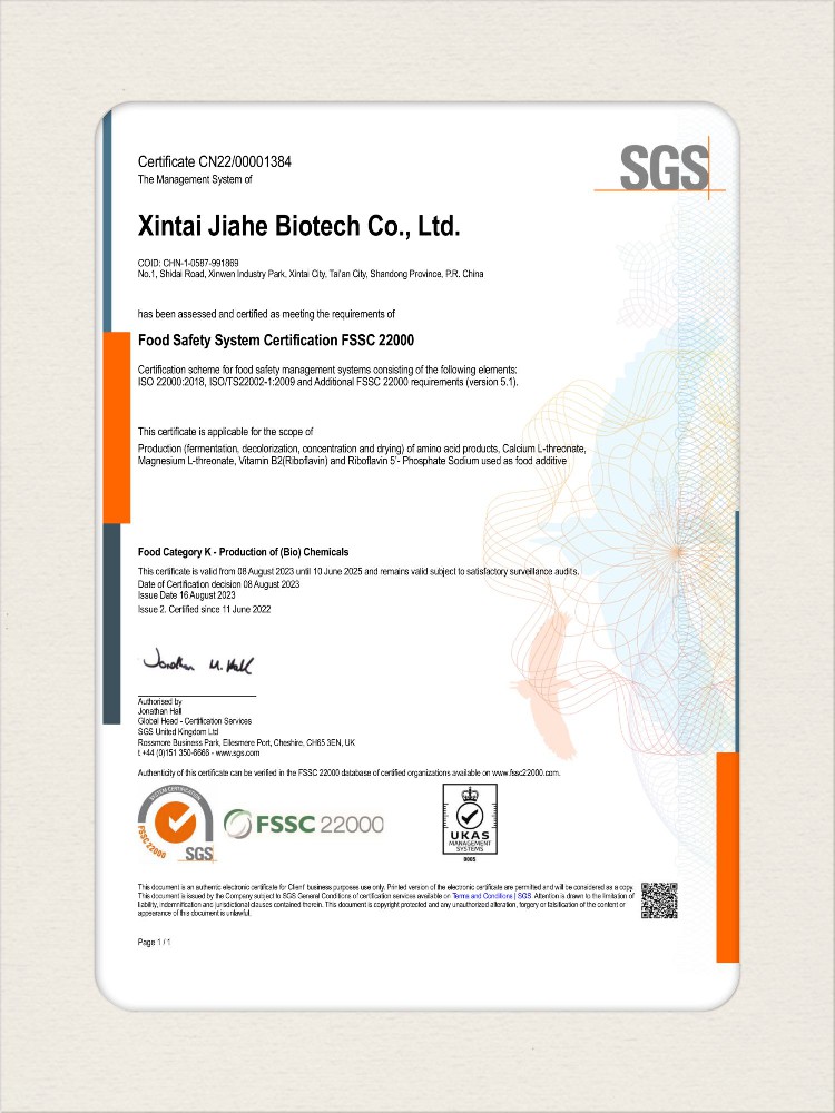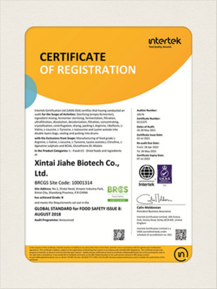 汕頭佳禾生物科技有限公司是一家致力于氨基酸及其衍生物研發(fā)、生產(chǎn)和銷售的國家高新技術(shù)企業(yè),先后通過了國家藥品GMP認證,ISO9001質(zhì)量體系認證、ISO14001環(huán)境管理體系認證。目前,公司擁有“廣東省專精特新中小企業(yè)”、“廣東省氨基酸產(chǎn)品工程技術(shù)研究中心”、“汕頭市生物發(fā)酵工程技術(shù)研究開發(fā)中心”、“汕頭市知識產(chǎn)權(quán)優(yōu)勢企業(yè)”、“多項國家發(fā)明專利”、“廣東省守合同重信用企業(yè)”等多項資質(zhì)和榮譽,旗下“佳禾牌”系列產(chǎn)品已成為原料藥行業(yè)知名品牌。 新泰市佳禾生物科技有限公司成立于2012年8月,注冊資金2億元,公司位于山東泰安新泰市新汶工業(yè)園區(qū),是國 家級高新技術(shù)企業(yè)、山東省“專精特新”企業(yè)、山東省制造業(yè)單項冠軍企業(yè)、泰安市科技型中小企業(yè)、泰安市農(nóng)業(yè)產(chǎn)業(yè)化龍頭企業(yè)、中國生物發(fā)酵產(chǎn)業(yè)協(xié)會理事單位。